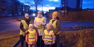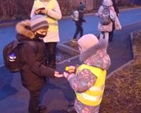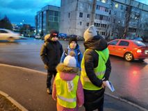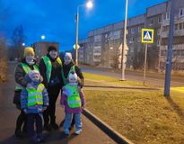 Дошкольники с родителями напомнили детям-пешеходам о правилах безопасности при переходе дороги, о необходимости быть внимательными, не отвлекаться, использовать световозвращающие элементы.