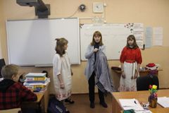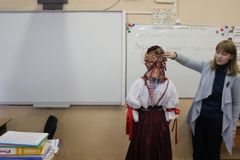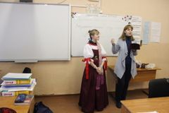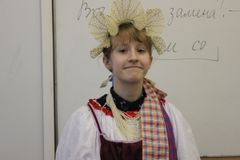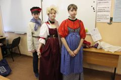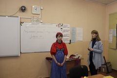 Из Национальной библиотеки РК в школу приезжала методист Екатерина Владимировна, которая провела занятие "Народный костюм Карелии" в 6 "А" классе. Она рассказала про карельскую одежду и продемонстрировала наряды на ребятах.