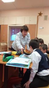 Третьякова Жанна Васильевна, почетный работник общего образования, учитель русского языка и литературы МОУ «Средняя школа №35» провела мастер-класс для группы детей 1-2 классов. Ребята читали в слух, пели песни, по ролям рассказывали сказку «Колобок», узнали что такое «сусеки»; «амбар», «сени». В конце занятия Жанна Васильевна всех детей угостила еще горячим колобком, который испекли для детей работники нашей столовой.
