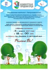 5 апреля в 18:00 в большом зале Администрации Петрозаводска (каб. 203) пройдет собрание граждан для обсуждения предложений о включении в муниципальную программу формирования современной городской среды на 2017 год общественной территории, подлежащей благоустройству в 2017 году.